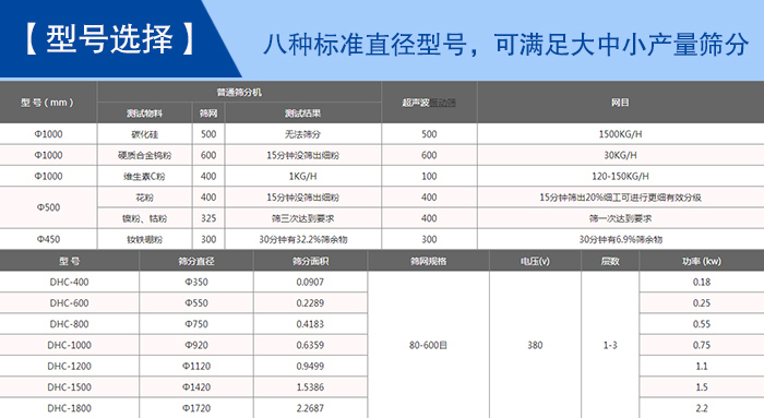 【型號(hào)選擇】—— DHC系列超聲波振動(dòng)篩型號(hào)有:DHC-400、DHC-600、DHC-800、DHC-1000、DHC-1200、DHC-1500、DHC-1800、DHC-2000等八種標(biāo)準(zhǔn)直徑型號(hào),可滿足100目—600目的細(xì)網(wǎng)篩分,每小時(shí)500KG—3000KG的大中小產(chǎn)量篩分。