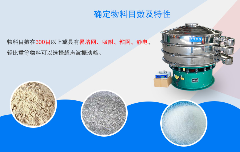 超聲波振動篩是在旋振篩基礎上加裝了超聲波裝置,可以有效解決普通振動篩在篩分粉末時的堵網問題,篩分精度和產量更高,那么超聲波振動篩如何選型呢?接下來就為您帶來介紹: